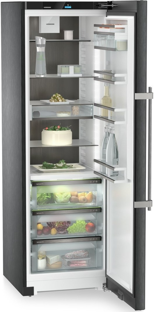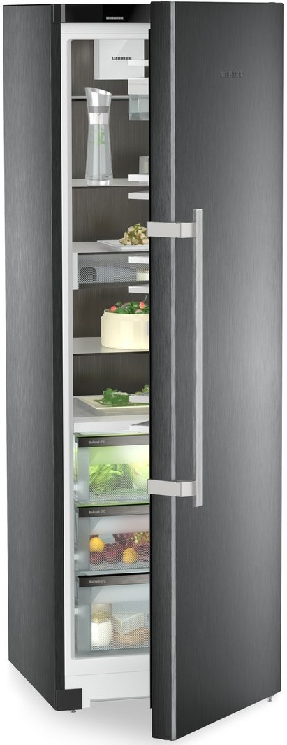 Внутрішній дизайн BlackSteel, що підкреслює красу кухні в темних відтінках. Задню стінку й внутрішню поверхню дверцят приладу виготовлено з ефектної чорної нержавіючої сталі. А завдяки спеціальному захисному покриттю на них не залишається слідів від пальців. Обрамлення BlackSteel доповнює вишукані темні тони приладу. Холодильник Liebherr із внутрішнім дизайном BlackSteel ідеально вписується в інтер’єр сучасних кухонь у темних відтінках і вирізняється елегантністю.