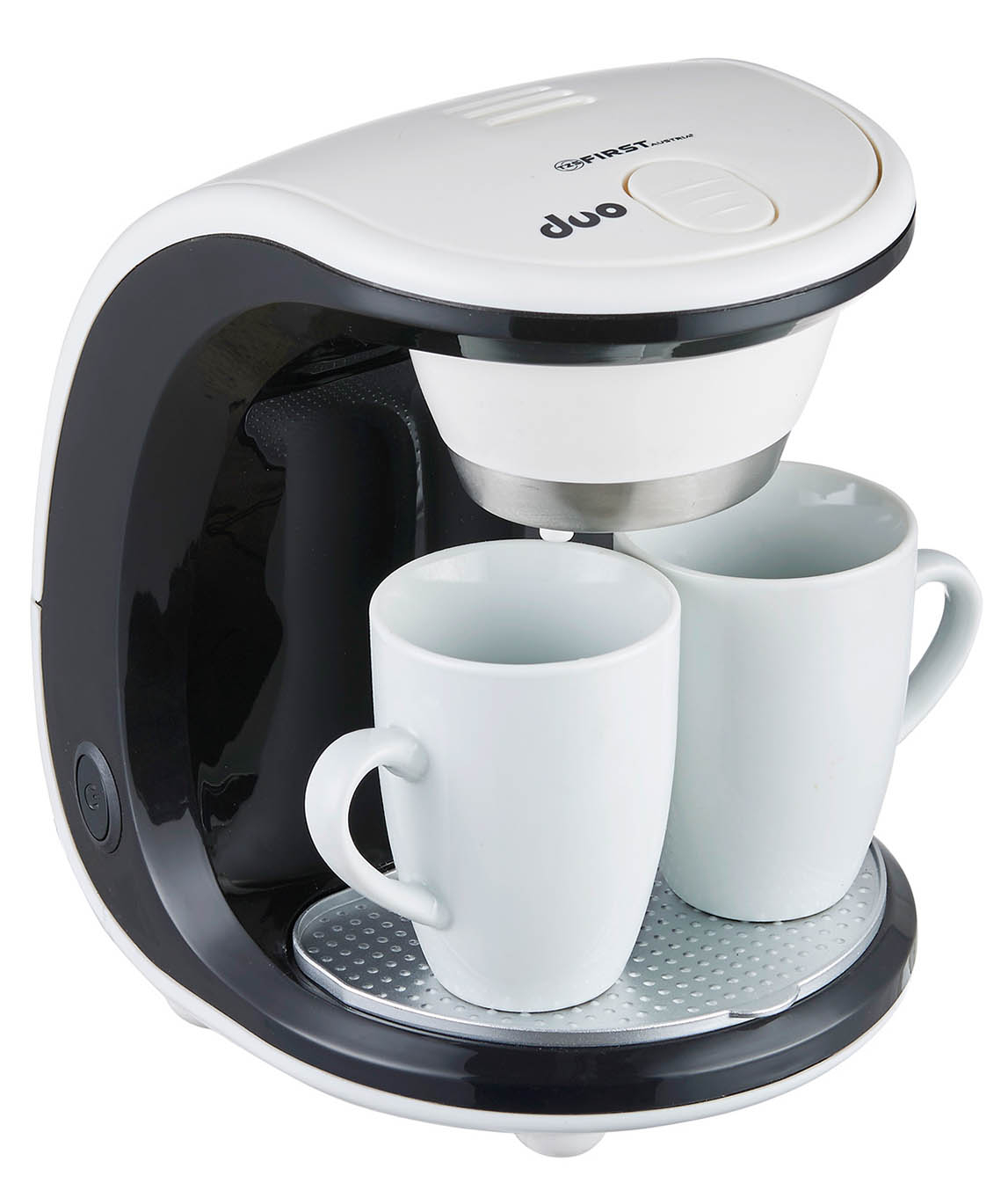 Корпус кавоварки First FA 5453-2 зроблений із пластику та представлений у біло-чорному кольоровому варіанті. В цілому моделі характерний приємний і стильний дизайн, який не тільки впишеться в інтер'єр Вашої кухні, але і може стати важливим елементом її декору. На верхній частині кавоварки First FA 5453-2 знаходиться кнопка відкривання кришки. Під кришкою розміщений вбудований резервуар для чистої води та відсік із постійним фільтром для кави. Фільтр знімний, що легко миється. Для приготування використовується мелена кава. Корисний об'єм резервуару для води: 0,25 л. Всередині резервуару можна побачити позначки з рівнем води. Перша відмітка – для приготування одного кухля кави, друга – двох кухлів. Два порцелянові кружки йдуть у комплекті з кавоваркою.