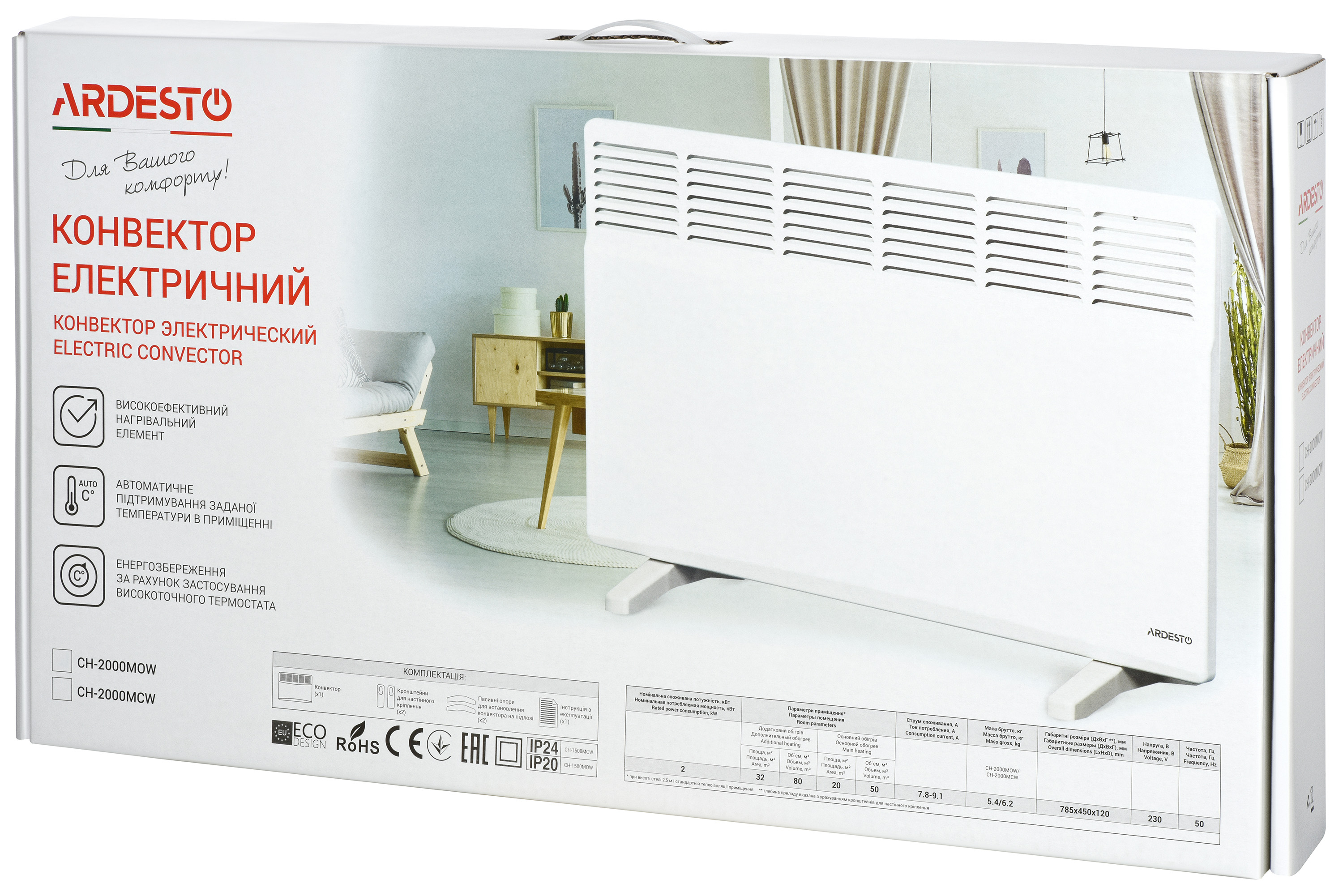 | Комплектація | електроконвектор,кронштейни для настінної установки,пасивні опори для установки на підлозі,інструкція |