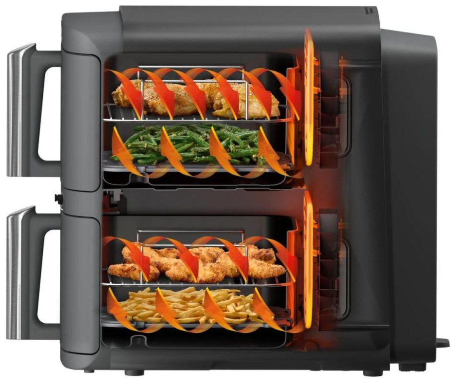Унікальна DoubleStack технологія дозволяє готувати до чотирьох різних страв одночасно завдяки двом тандему кошикам по 4,75 л і раковинам‑рінгерам. Ваш обід — персоналізовано та ефективно.
