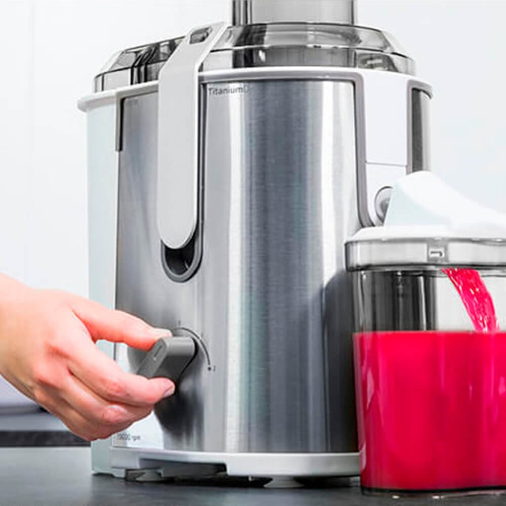З соковижималкою StrongTitanium 19000 XXL можна зручно готувати різноманітні соки. StrongTitanium 19000 XXL дозволяє отримати з фруктів на 30% більше вітамінів завдяки відцентровій системі та 19 000 швидкісних оборотів. Така швидкість віджиму добре зберігає поживні речовини. Титановий диск Диск з покриттям титану відмінно зберігає свою форму, гостроту і гарантує довгу експлуатацію. XXL-отвір Широкий отвір діаметром 75 мм дозволяє віджимати цілі фрукти та овочі. Потужність З потужністю 650 Вт ви отримаєте чудові результати віджиму будь-яких продуктів. Дві швидкості Дві регульовані швидкості допомагають адаптувати соковитискач до будь-якого типу страв. Місткість для м'якоті У корпус вбудована ємність для м'якоті об'ємом 500 мл. Безпека Матеріали соковижималки не містять бісфенолу А і не є токсичними. Зручне очищення Усі не електричні компоненти соковижималки можна очищати в посудомийній машині.