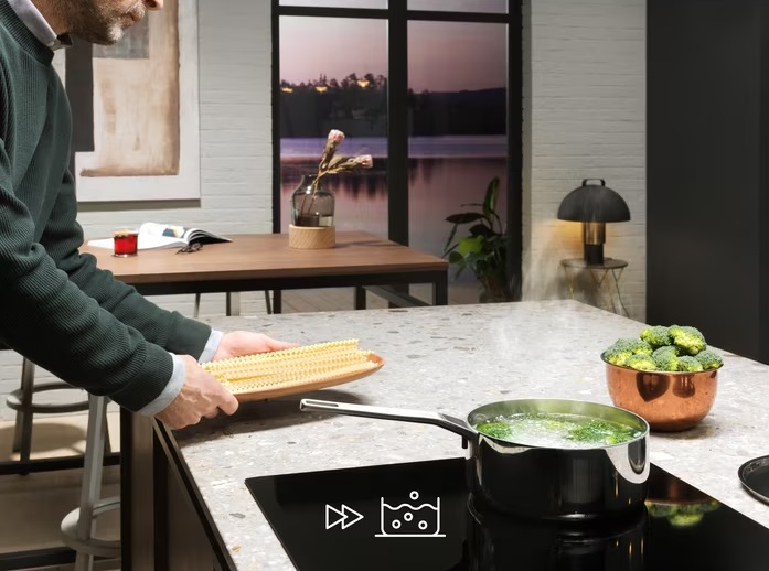 Індукційна варильна поверхня моделі 300: нагрів буде і сильніше, і швидше. Без необхідності розпалювання газу або розігріву спіралей конфорки швидко досягають високих температур, і вода закипає швидше ніж будь-коли. Миттєвий відгук на зниження температури дає повний контроль. Легко, швидко і безпечно — Індукція. Індукційна технологія означає, що тепло постачається швидко і точно у правильне місце, а навколишня зона залишається прохолодною та безпечною. Вона також миттєво реагує на зміну температури. А гладенька поверхня легко очищується.