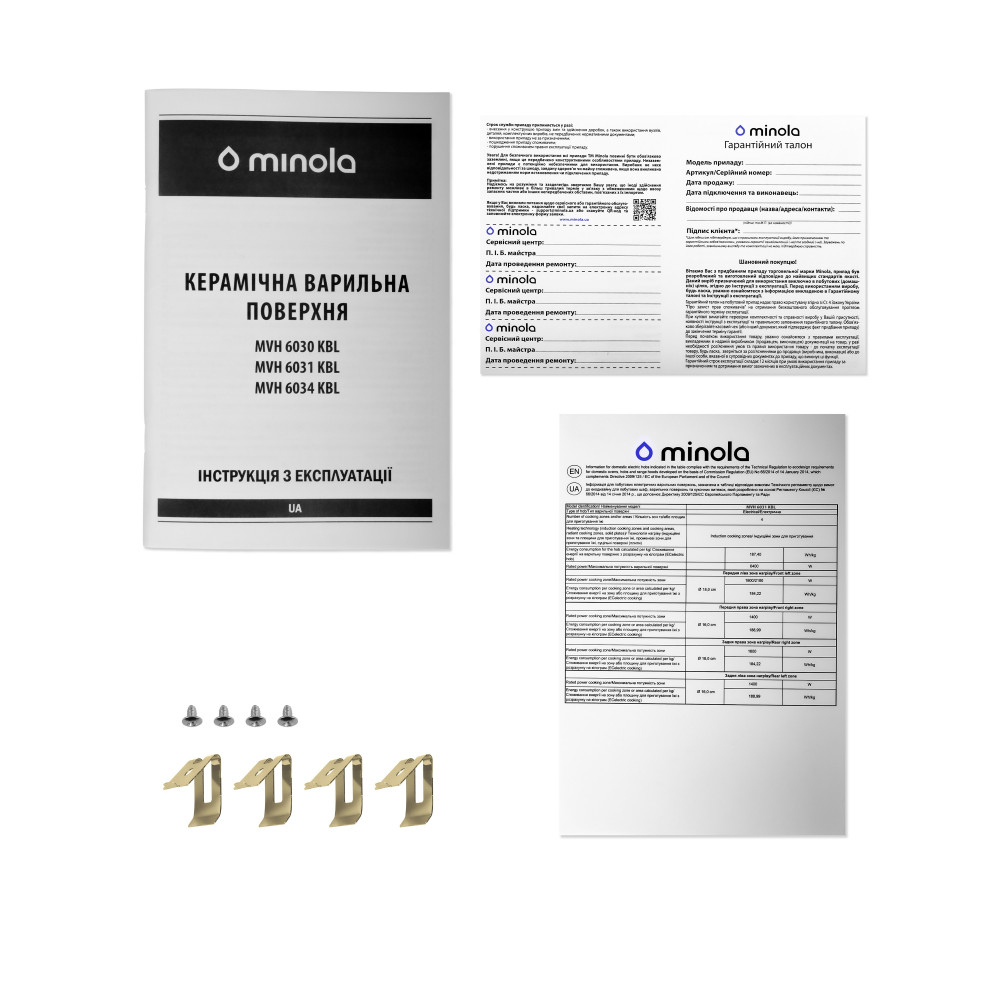 КомплектаціяВарильна поверхня<br/> Інструкція<br/> Гарантійний талон<br/> монтажний комплект<br/> Шнур живлення без вилки
