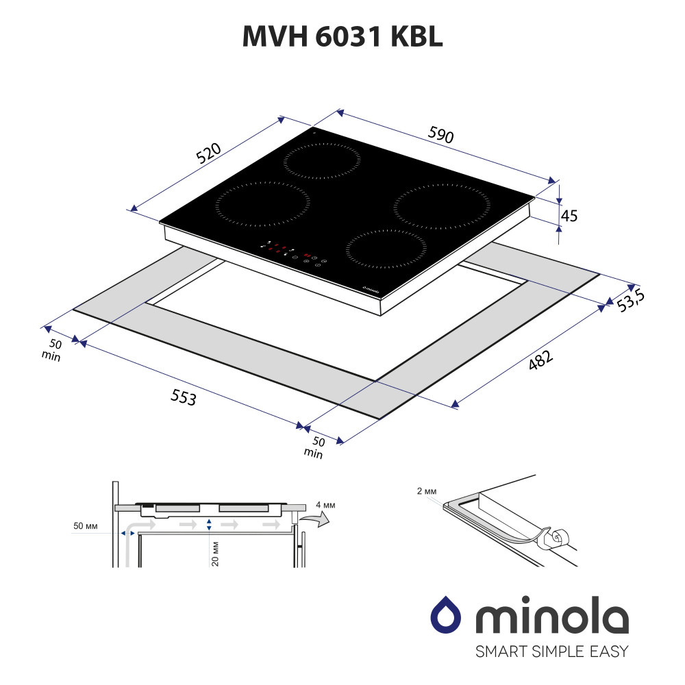 Електрична варильна поверхня Minola MVH 6031 KBL виготовлена з використанням склокераміки Kanger, яка відрізняється своєю стійкістю до перепадів температур та механічних пошкоджень.