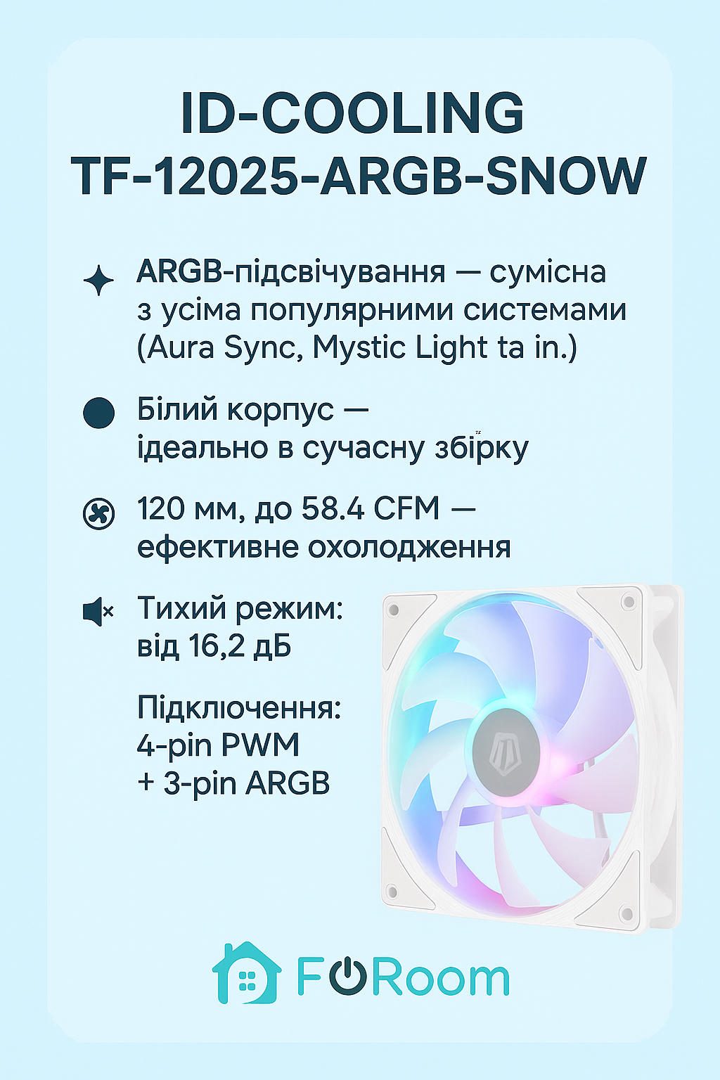 Купуйте вентилятор ID-COOLING TF-12025-ARGB-SNOW у Foroom — охолодження, що виглядає стильно