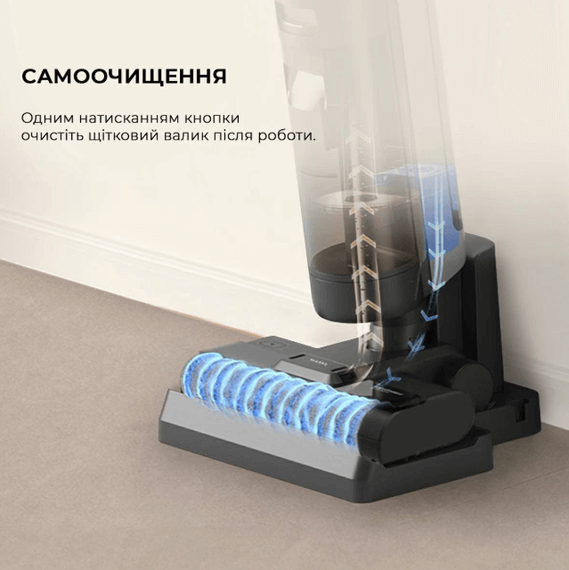 Час автономної роботи до 35 хвилин забезпечує можливість прибирати великі площі без підзарядки. Функція сушіння щітки після прибирання підтримує гігієну та продовжує термін служби пристрою. Ергономічна ручка та маневреність дозволяють легко дістатися навіть у важкодоступні місця.