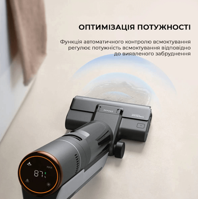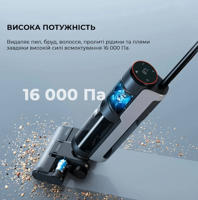 Dreame H12 Pro (HHR25A) поєднує високу потужність всмоктування з функціями миття підлоги. Пристрій має технологію автоматичного регулювання потужності залежно від рівня забруднення, LED-дисплей для контролю параметрів і систему самоочищення щітки. Ємні баки для чистої та брудної води дозволяють виконувати прибирання без частих зупинок.