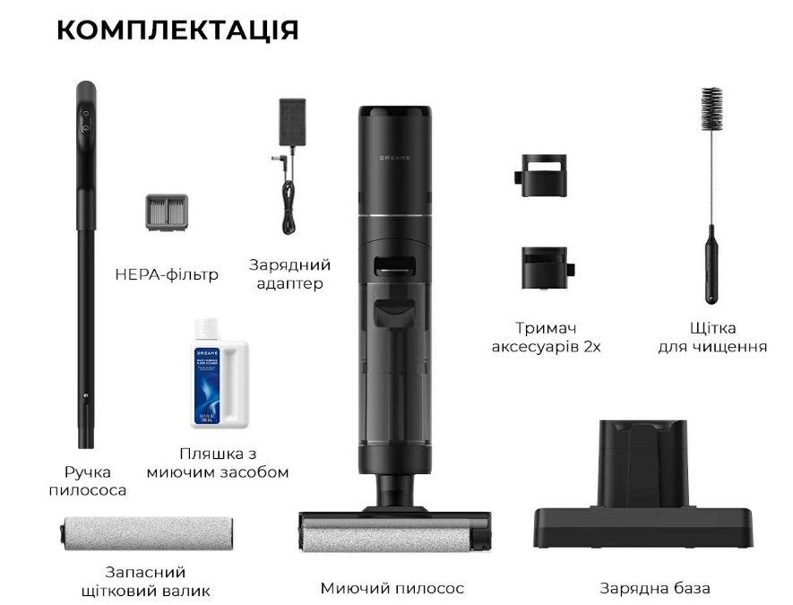 Комплектація заводськаПилосос, Зарядна база, Чистка щітка, Змінний фільтр, Запасний щітковий валик, Розчин, що чистить, Тримачі аксесуарів, Адаптер живлення, Документація