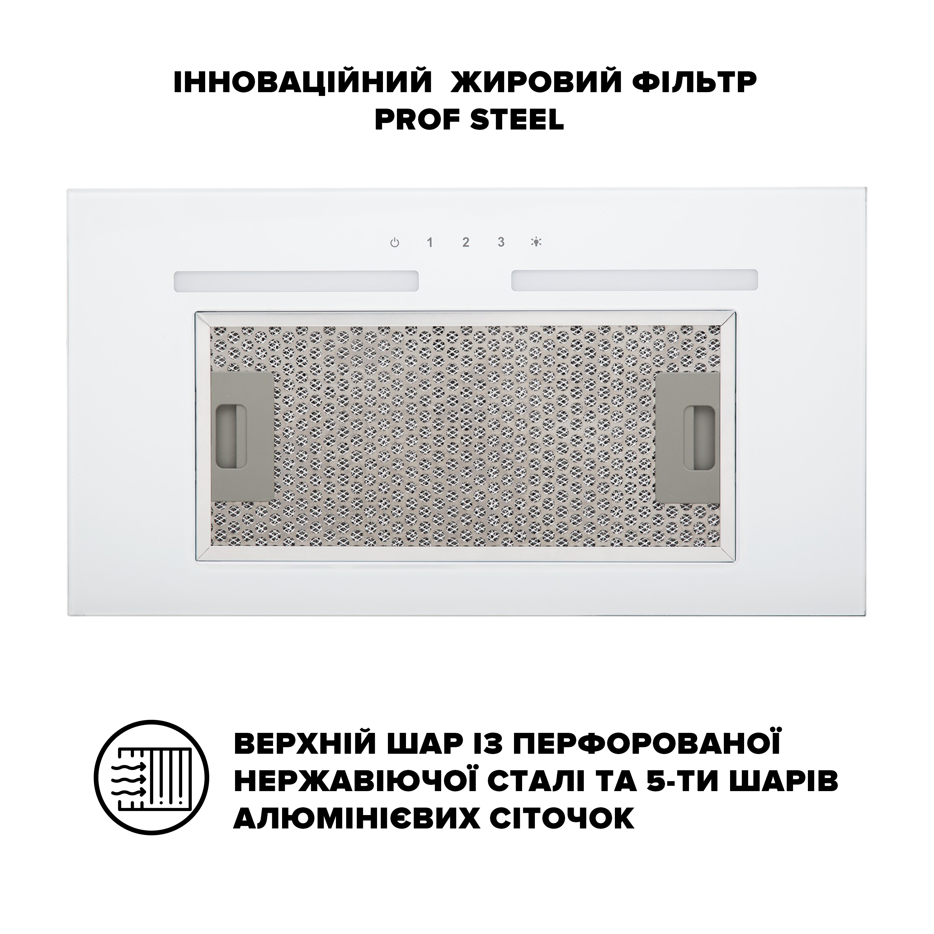 Інноваційний жировий фільтр з верхнім шаром із перфорованої нержавіючої сталі і нижнім шаром з особливою п'ятишаровою конструкцією,