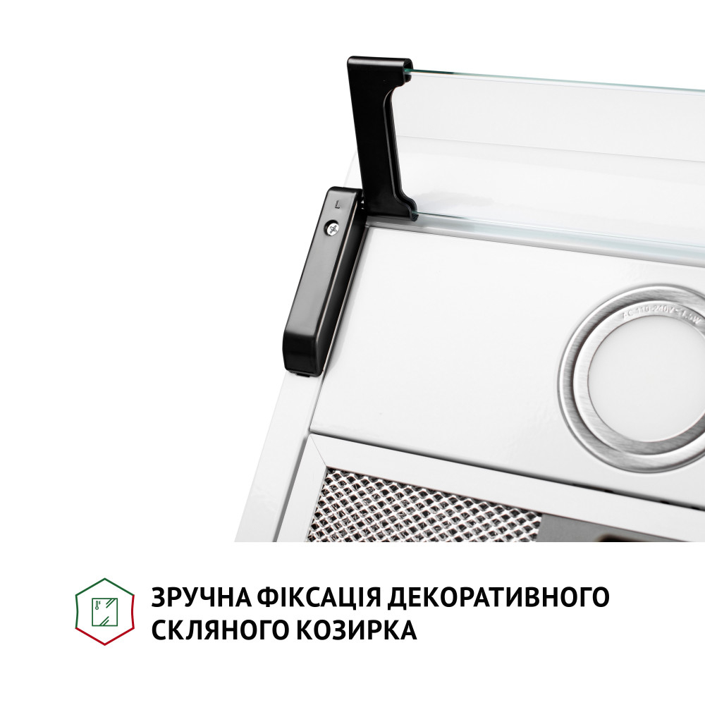 Крім свого основного завдання, така кухонна витяжка має ергономічну функцію і дозволяє раціонально використовувати простір у зоні над варильною поверхнею.