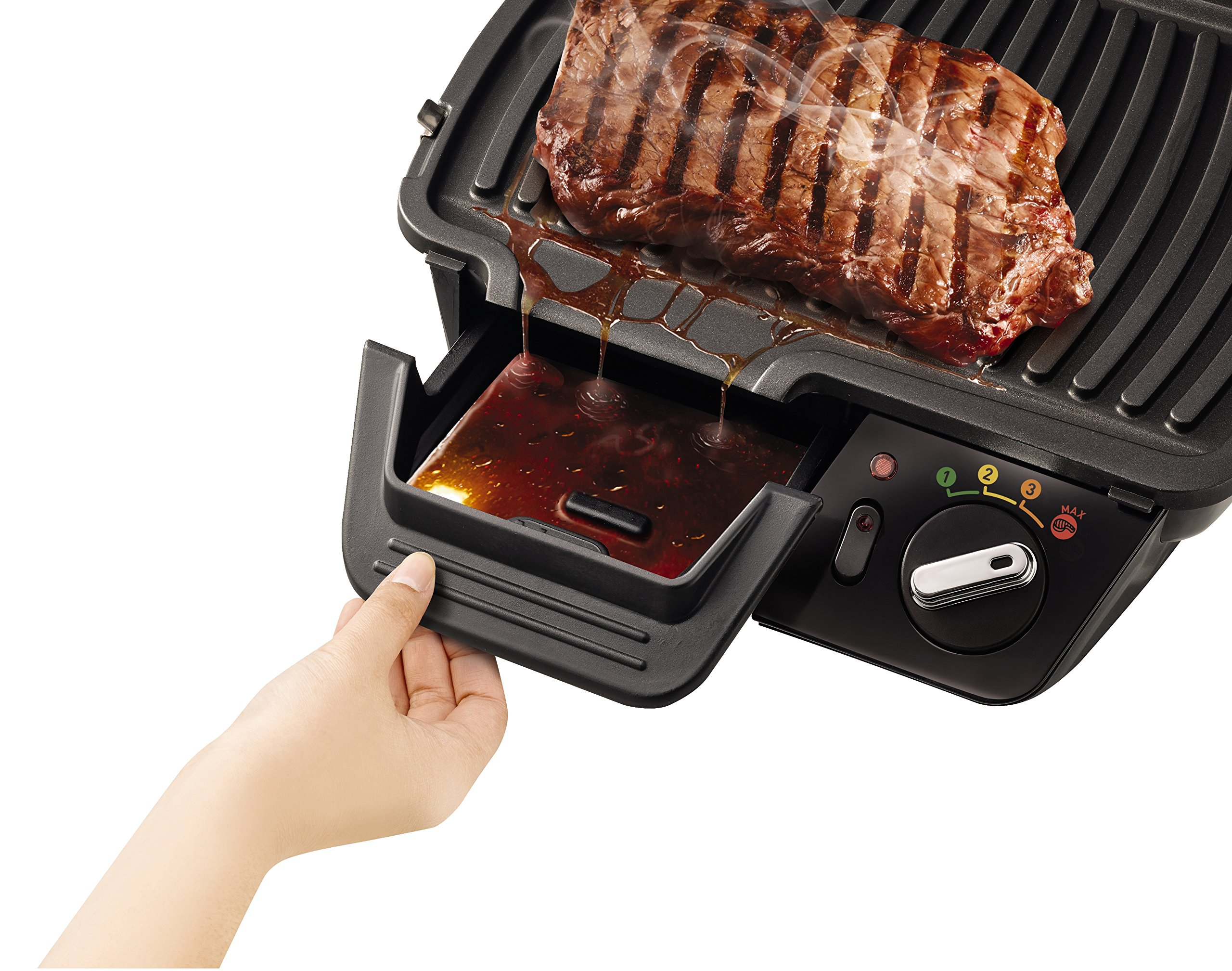 Равномерный двусторонний нагрев доводит любые продукты до идеальной готовности: за 5-10 минут мясо равномерно пропечется, оставаясь при этом максимально сочным, а овощи можно будет подавать к столу спустя всего 3 минуты! Благодаря антипригарному покрытию, все блюда готовятся без добавления масла, а излишки жира стекают по глубоким желобкам съемных пластин в поддон для сока.