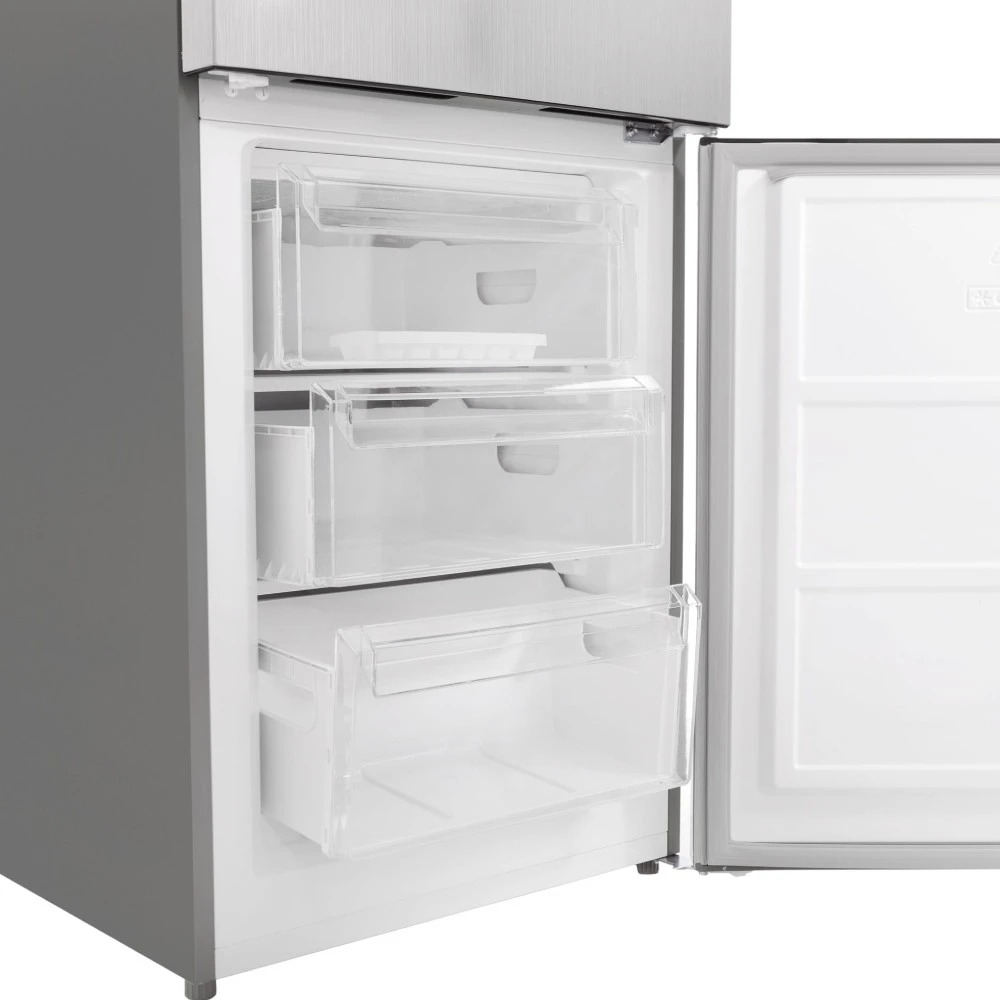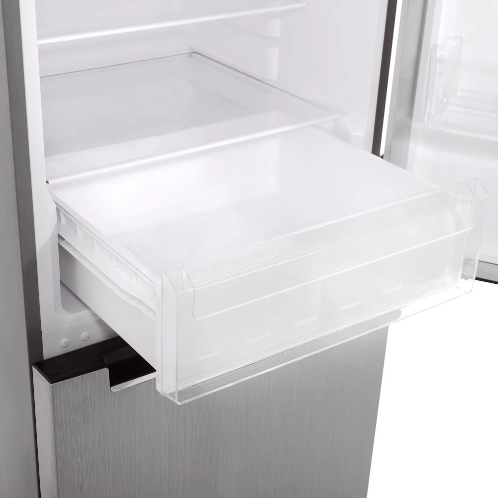 Полки выполнены из ударопрочного стекла, что позволяет размещать даже тяжёлые кастрюли и банки. Вместительное отделение для овощей и фруктов с возможностью регулировки влажности идеально подходит для тех, кто ценит свежесть натуральных продуктов.