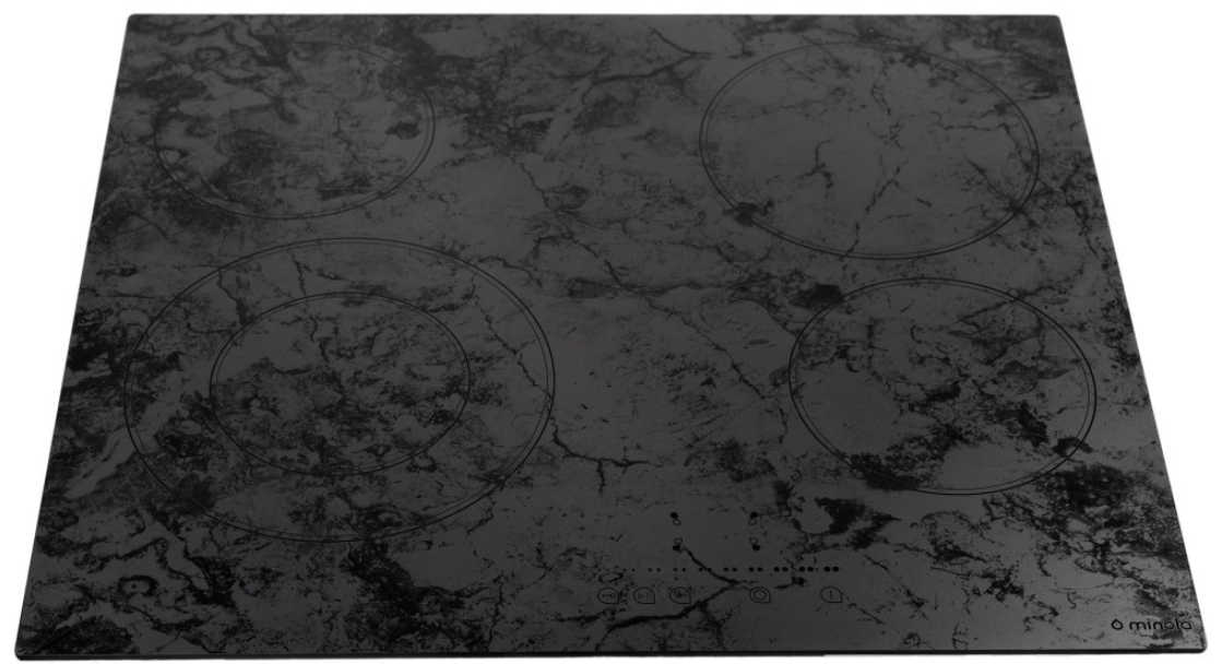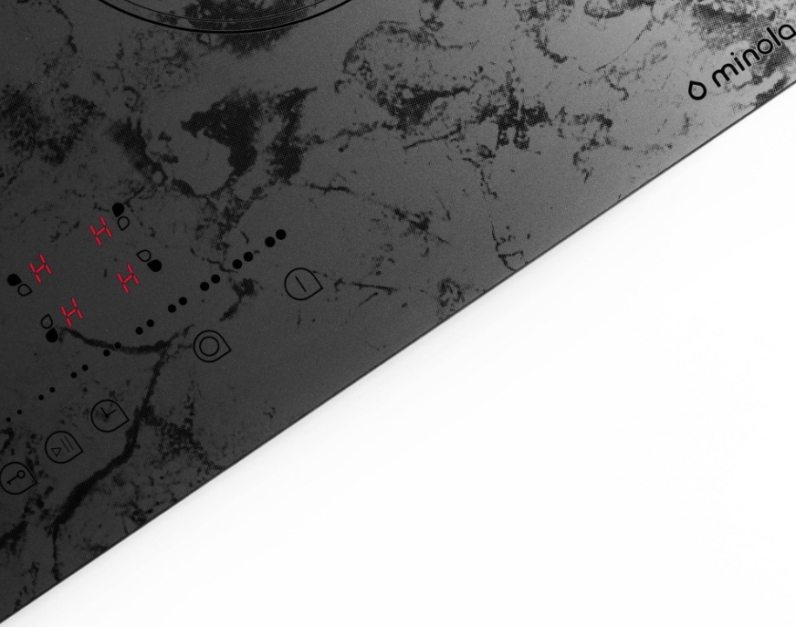 Варочная поверхность Minola MHS 6272 KMR оборудована слайдерно-сенсорной панелью управления, на которой размещены сенсоры включения и выключения прибора, блокировки и выбора зоны нагрева, а также сенсор-слайдер для переключения скоростей работы поверхности и установки времени работы таймера.