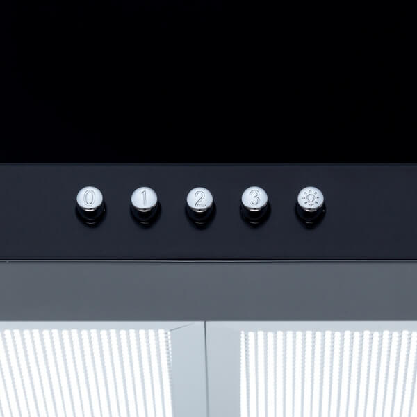 На окантовочной лицевой части корпуса вытяжки размещена горизонтальная механическая панель управления. На ней расположены кнопки переключения скоростей работы устройства, включения освещения и выключения прибора. Именно данный тип управления является наиболее простым и понятным в эксплуатации, кроме того кнопочная панель устойчива к механическим повреждениям и перепадам температур.